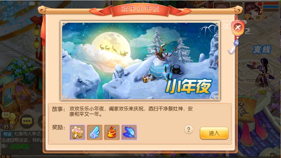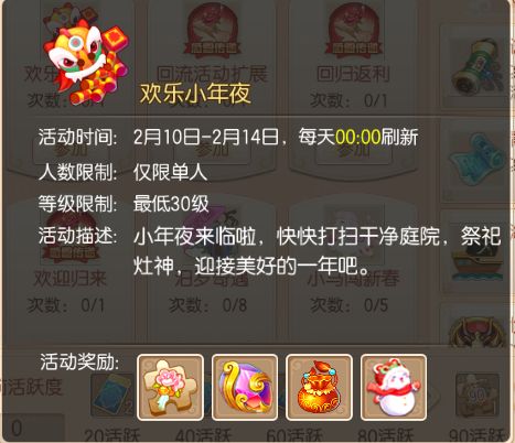 小年夜来临啦,快快打扫干净庭院,祭祀灶神,迎接美好的一年吧。2月10日-2月14日,等级≥30级的少侠需单人参与【欢乐小年夜】活动。