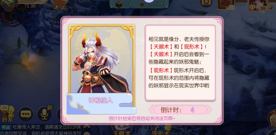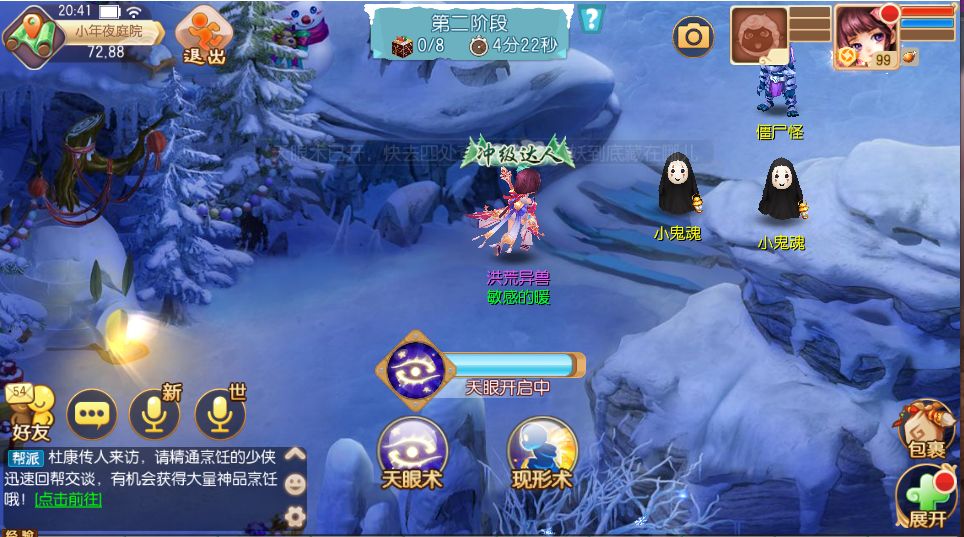 在活动的第二阶段中,少侠将会获得两个技能:天眼术和现形术。天眼术能帮少侠看到躲起来的鬼怪,现形术则能够让他们显形。当找到8个鬼怪后即可完成这个阶段,但同样的如果在规定时间内没有找到全部鬼怪,将按照找的个数发放奖励。