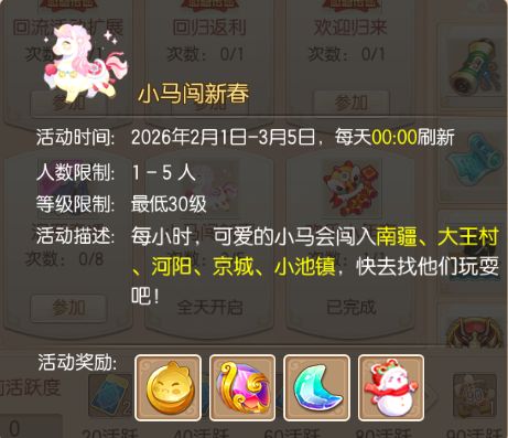 2月1日-3月5日,等级≥30级的少侠可以1-5人组队参与【小马闯新春】活动,到各个地图寻找小马并挑战它们获得奖励!每人每天可以获得5次奖励,奖励包含:募灵石、8888金币、幸运石、黄金鸟和1龙币。少侠们请加油挑战小马吧!