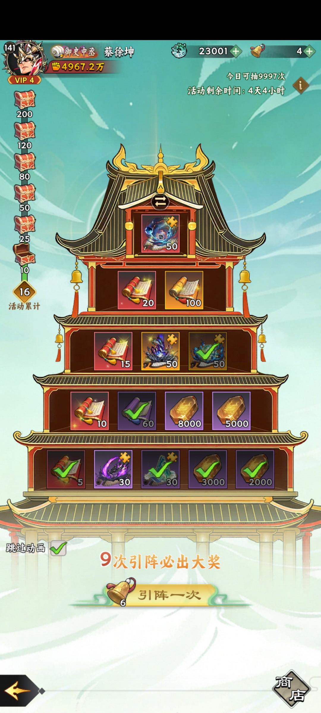 草船借剑选楼船,楼船好像有两种,第一次玩连续点击下面的擂鼓就可以加快箭矢收集,撞到小船或石头会减少蓄力条,这是调好方向后继续连续点击擂鼓,只要完成一次最高分12000分,瑕疵就可以点右下角跳过,跳过会按之前的分数进行结算,以后每天都不用进去连续点击擂鼓了。