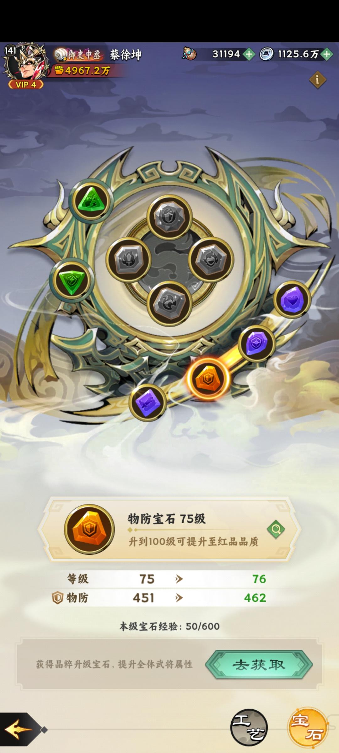 宝石里注意防御精粹是通用的,第二个是物防宝石经常花完防御精粹,第三个的法防宝石就没精粹升级。物防和法防宝石按阶段升级,先升一个25级后再升另一个25级,接着再全部都升一个到50级,以此类推。