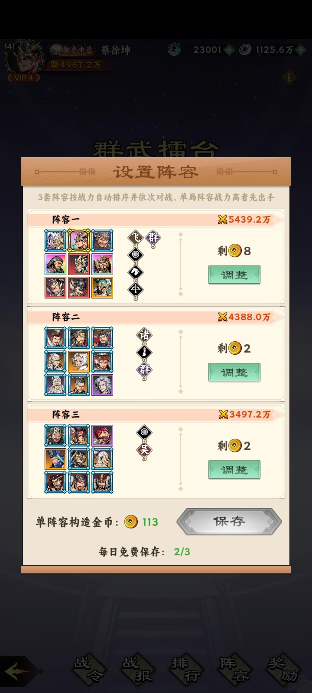 问鼎中原记得每天下线前检查调整好阵容,这个目前没有自动更新的功能。竞技场同理。