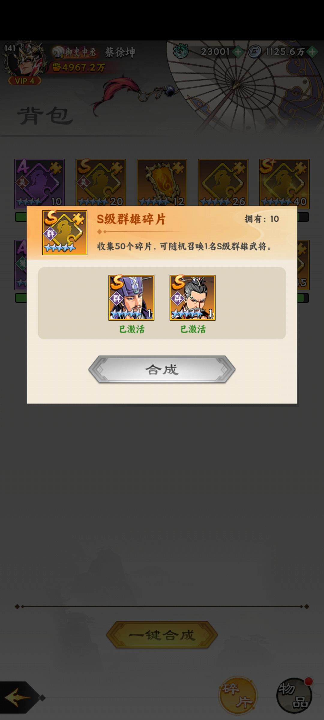 集市里每日商店,买满招贤令、征辟令、竞技战书。随机商店买满招贤令、征辟令、竞技战书,每天刷新都用完并买完,银币买完武将经验和进阶丹,S级武将碎片哪个阵容都可以买,但是只能开出该阵营的两种90资质的卡,开不了100资质和110资质的S+卡,90资质的卡前期直接上阵不用做材料,后面等高资质的卡数量多了之后再分解成材料。后面给出90资质卡养成建议。