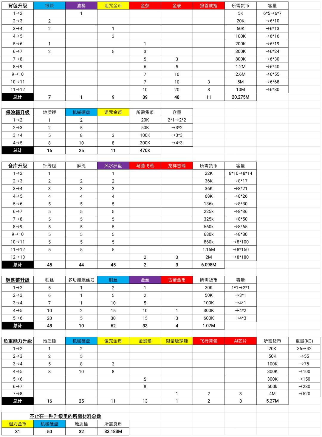 升级总共需要:针线包、麻绳、铁丝、地质锤、多功能螺丝刀、银块、机械硬盘、铜丝、风水罗盘、油桶、金丝、诅咒金币、限量版球鞋、金蜘耄、AI芯片、金表、金条、狼首戒指、飞行背包、马踏飞燕金塑、龙祥吉瑞、古董金币。具体见↓