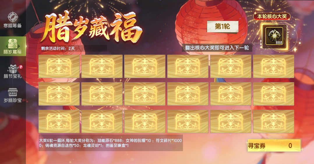 “腊岁藏福”翻翻乐玩法将趣味与珍稀奖励完美融合,持有腊寒寻宝券即可开启幸运挑战。