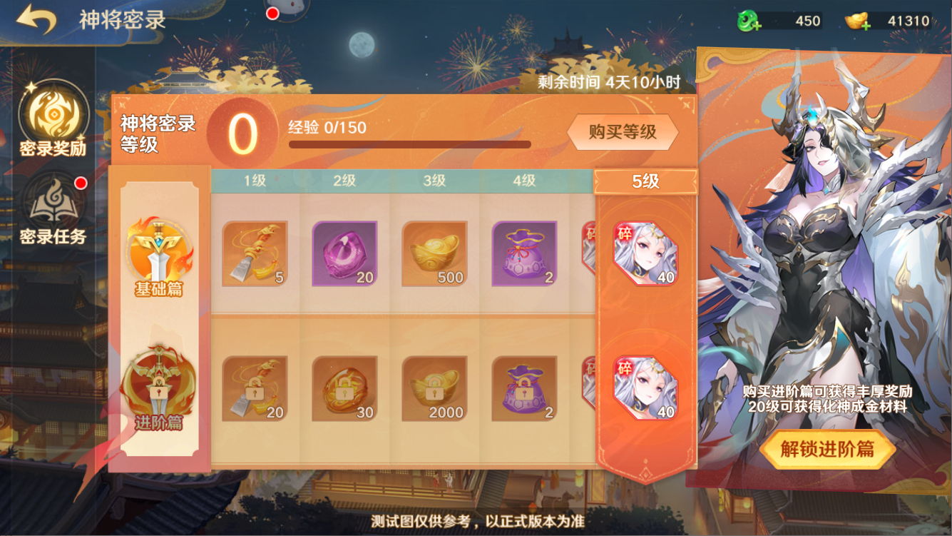 守护使完成密录任务获得经验后,就能够提升神将密录等级,达到一定等级就能免费获得基础篇的对应奖励,包括天工刻刃*20、白骨夫人碎片*120以及元宝、精炼石、随机宝石袋等道具。