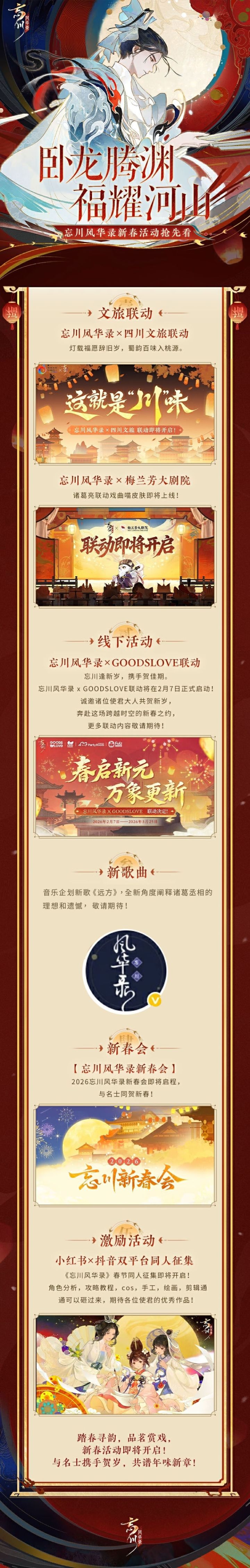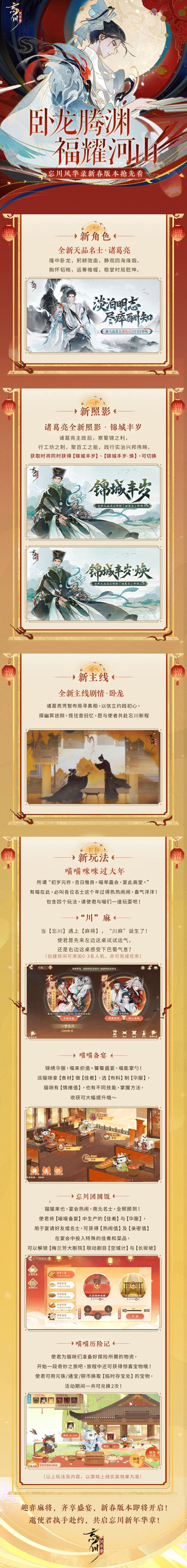 佳节临近,2026年的忘川新春盛典筹备正酣,小麒麟已经迫不及待为大家揭晓春节多重惊喜啦!全新名士诸葛亮及新照影,文旅国粹联动焕新,新曲盛会悉数上线,和忘川猫猫一起过大年,宴罢饭饱,还可搓一顿麻将!使君们来看看都有哪些精彩内容吧!