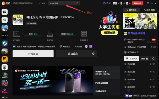 1. 打开雷神加速器搜索并进入“明日方舟终末地国际服”。