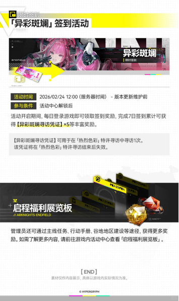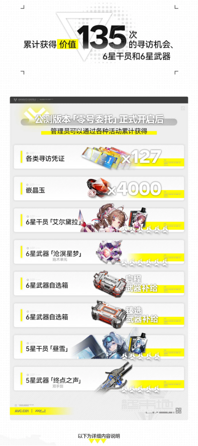 公测版本「零号委托」正式开启后,管理员可以通过各种活动累计获得价值135次的寻访机会、6星干员【艾尔黛拉】、6星武器【沧溟星梦(施术单元)】、6星武器自选箱【启程武器补给】、6星武器自选箱【臻选武器补给】、5星干员【昼雪】、5星武器【终点之声(双手剑)】等丰富奖励。