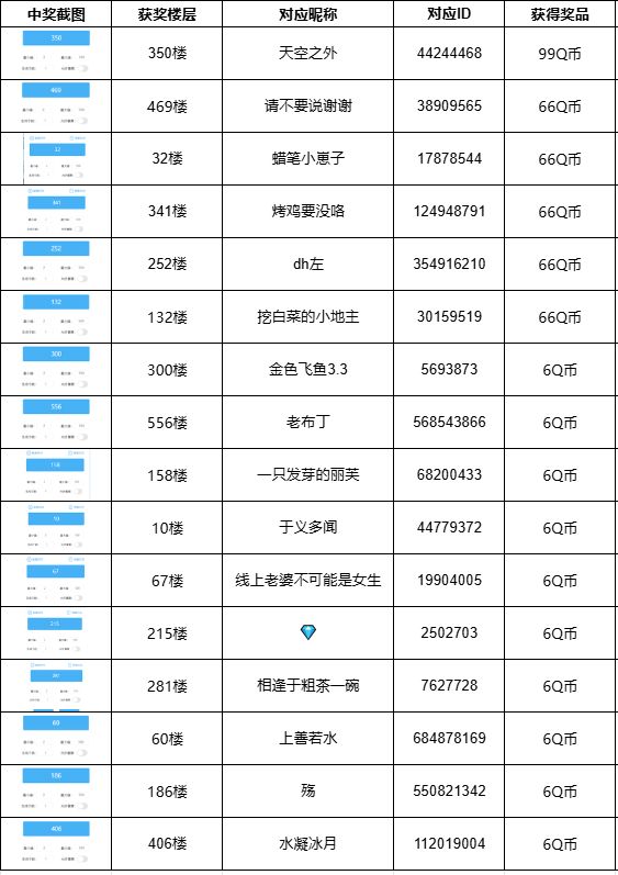 活动截至时有效楼层为2-588楼,经随机数抽取获取获奖楼层和名单如下: