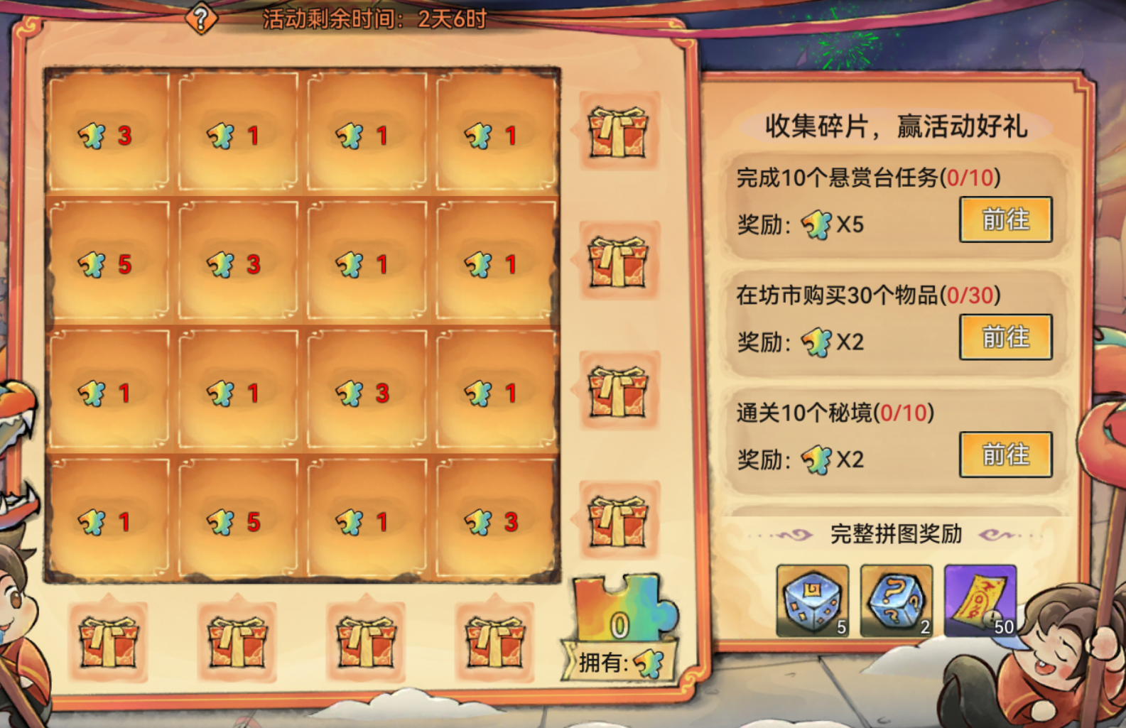 活动期间,祖师完成任务可获得拼图碎片,使用拼图碎片可解锁拼图。