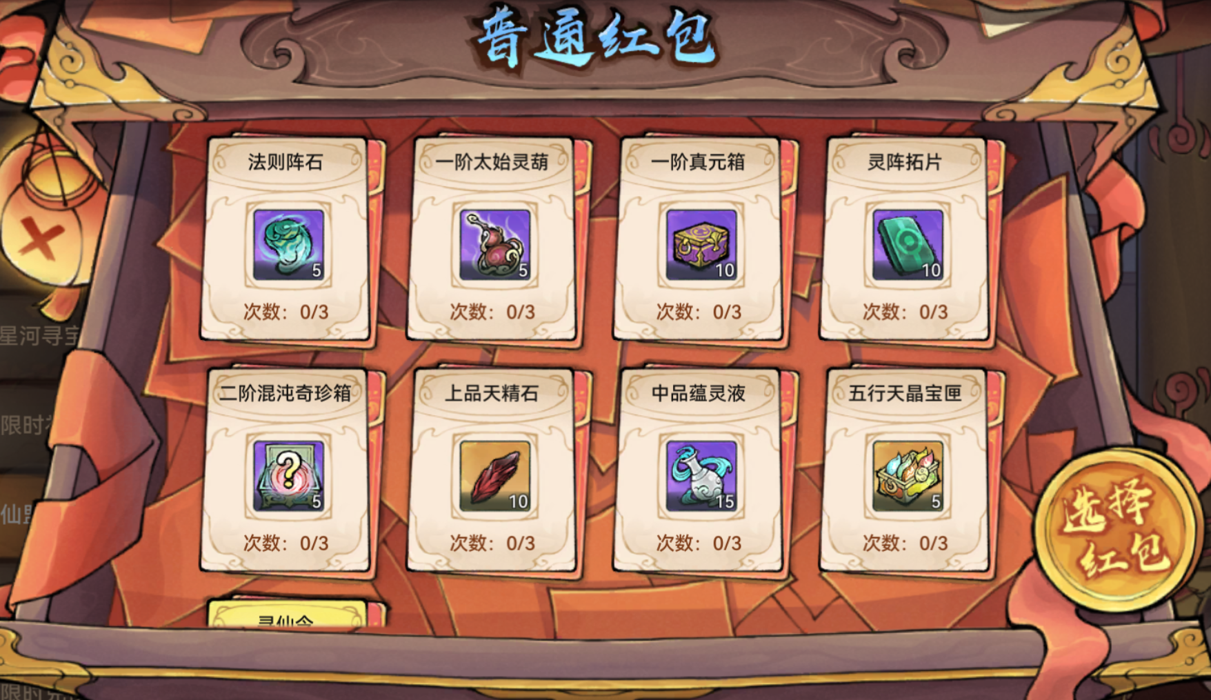 每次购买红包可获得积分和购买奖励,当积分累计到一定数量时,还可额外领取天机万象匣、真灵精血、混沌天命灵魄等奖励。
