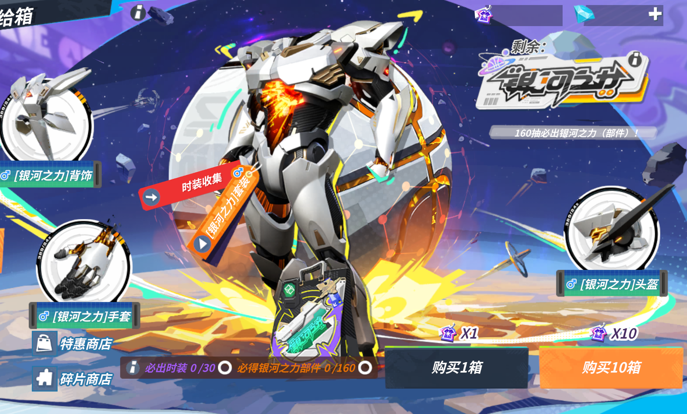 奢华时装【银河之力】限时上线,补给箱中好礼丰富,除了奢华时装外,还有多种高级时装可供抽取。补给箱30抽必出时装,160抽必得奢华时装部件。重复获得时装、涂鸦、庆祝动作、表情时,将自动转化为时装碎片!