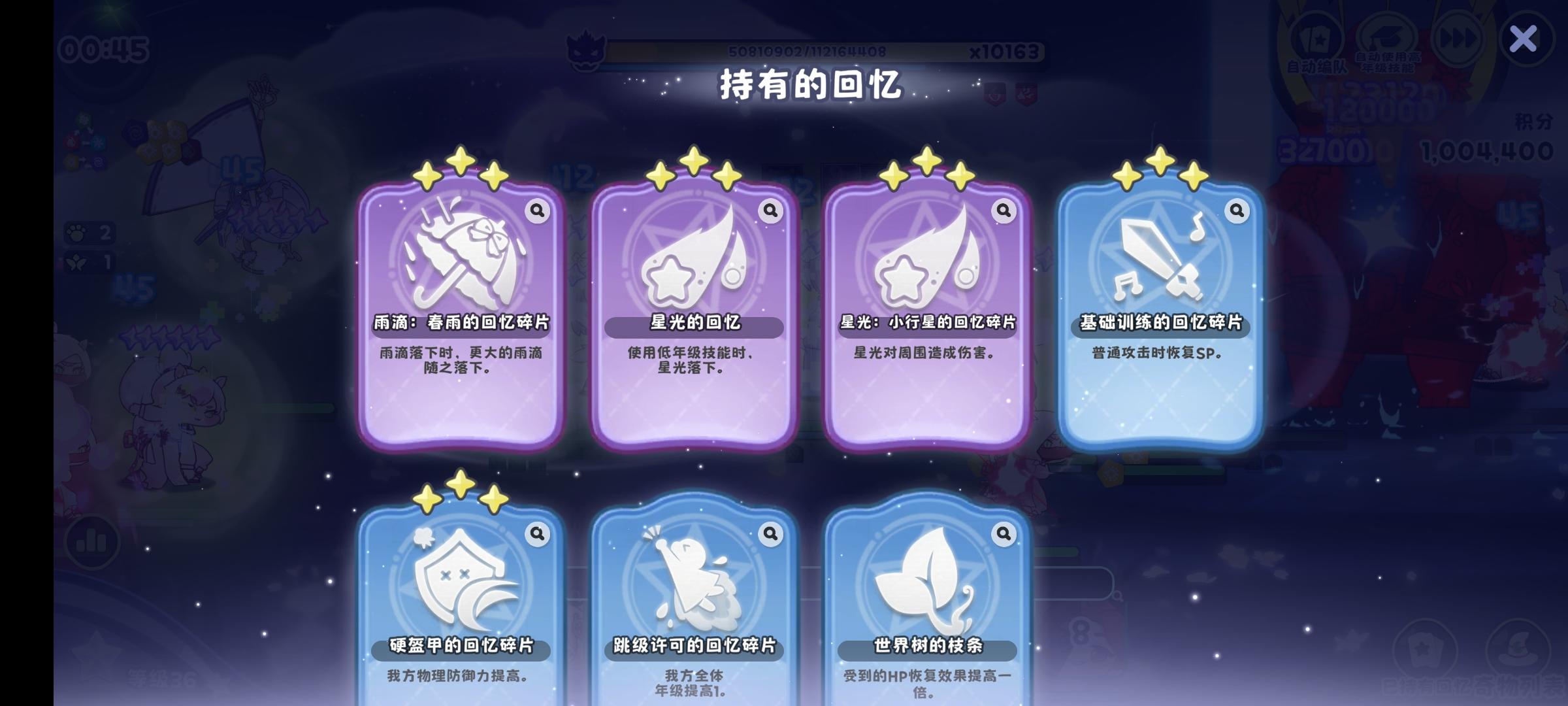 选择顺序:(雨滴的回忆)–(祝福的回忆)–(敏捷攻击的回忆)–(异端审判官)–(基础训练的回忆)–(星光的回忆)–(跳级许可证的回忆)–(硬盔甲的回忆)–(世界树的枝条)
