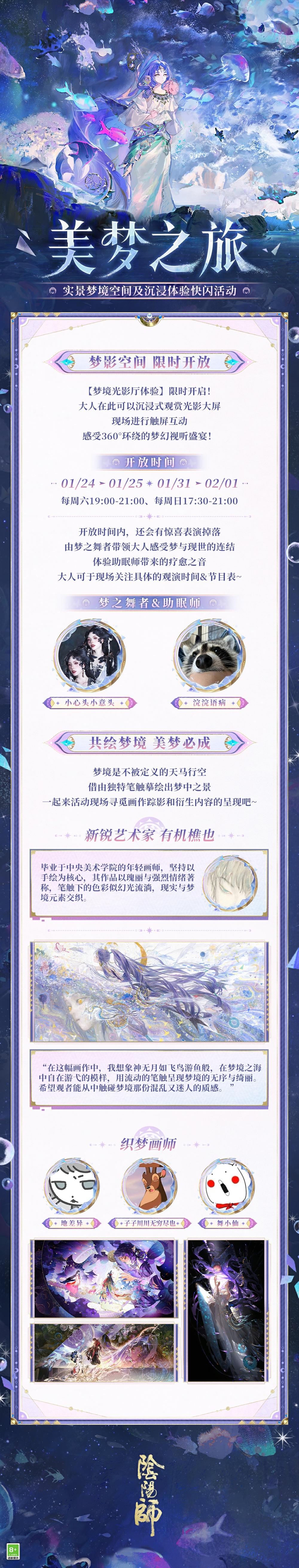 1月23日 - 2月1日,阴阳师「美梦之旅·实景梦境空间」将于 杭州·M511光影汇 展开。“梦之美学”跃出画卷,打破虚实的方圆之界,所有关于梦的瑰丽想象,都在这里变为可步入、可触碰的“梦之间”。