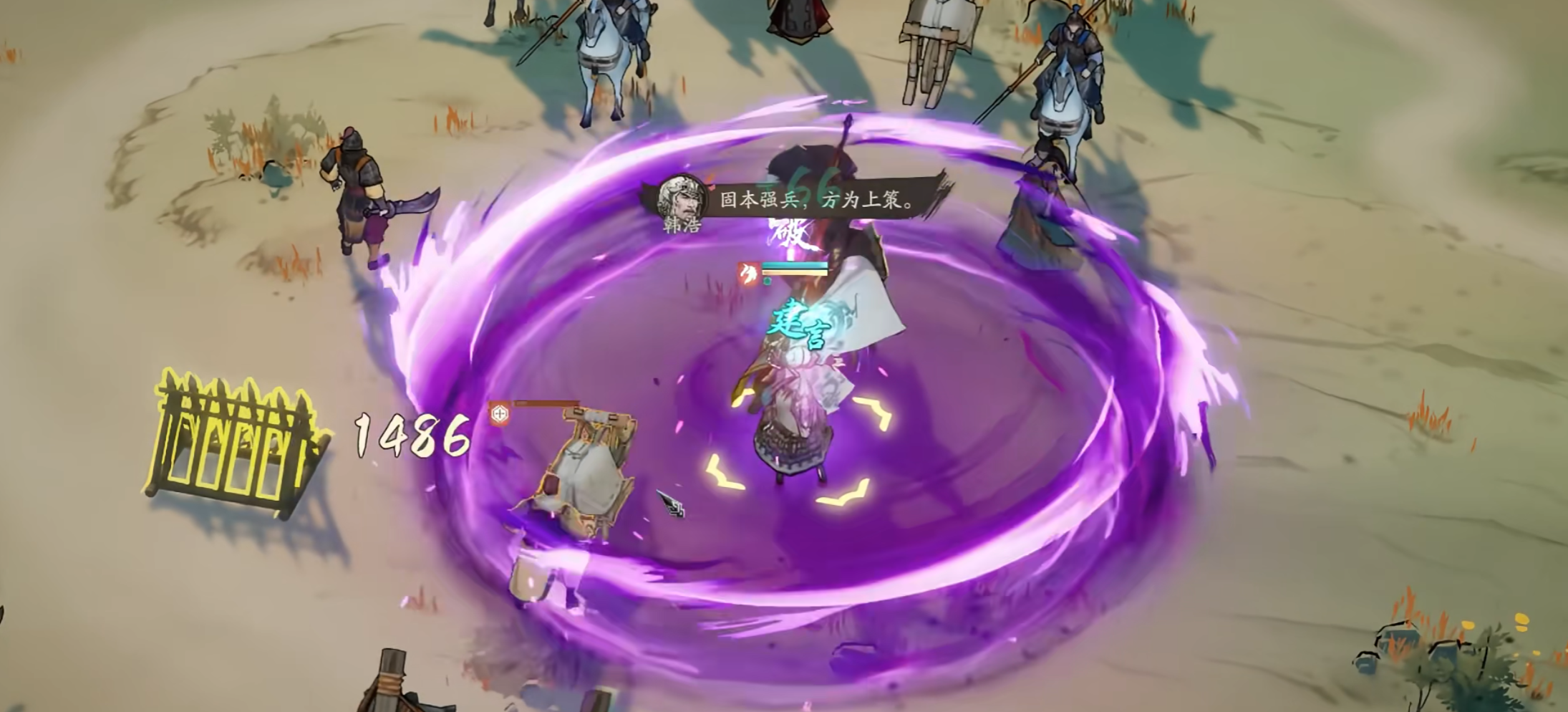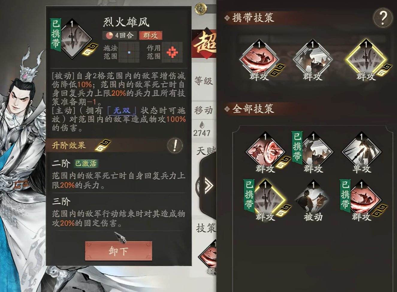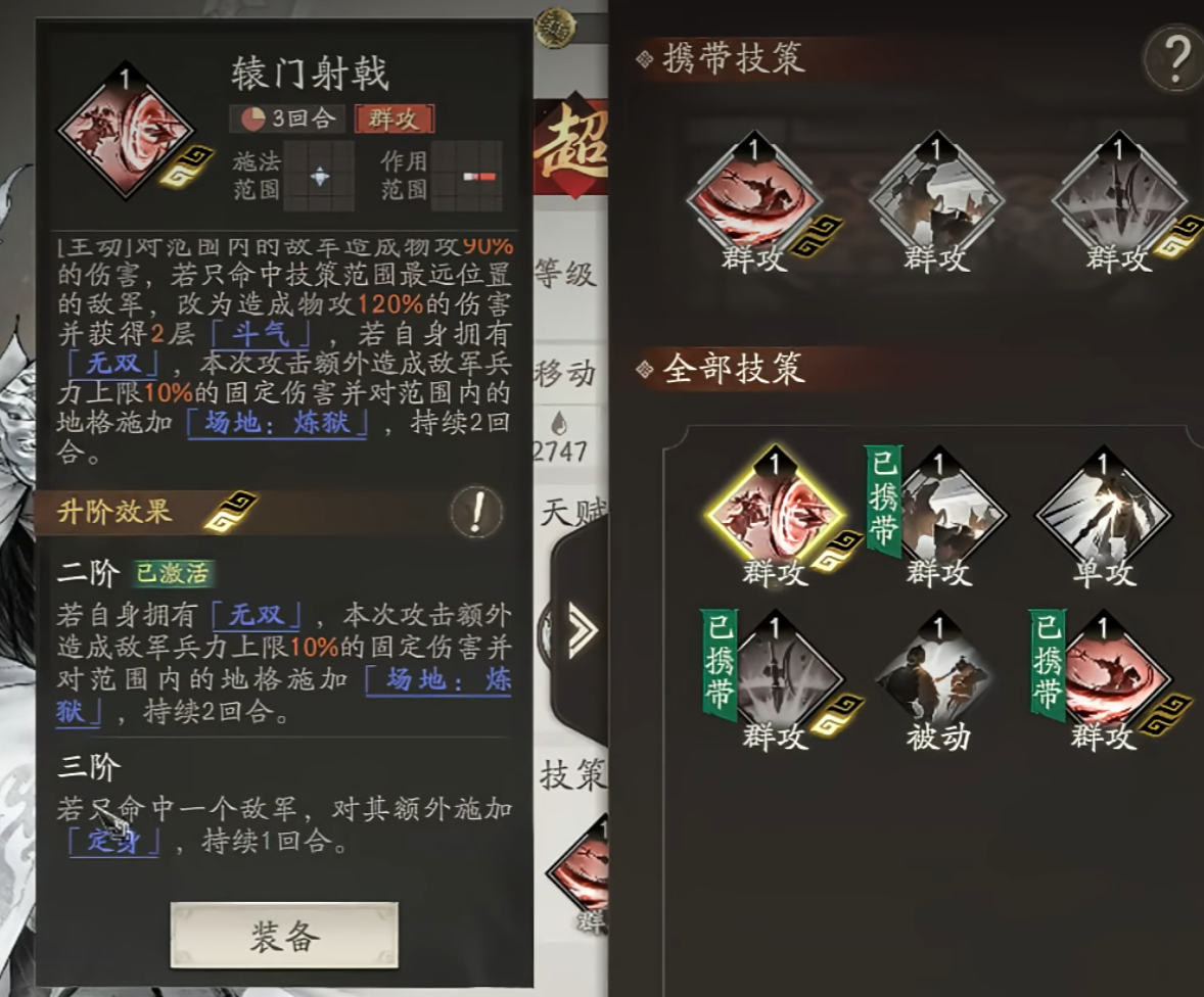 先说《辕门射戟》,开局就自带的直线技能,既能打1-4格的AOE,又能当单点用——要是只命中最远一格的敌人,伤害直接拉满到120%,还能拿两层斗气,简直是速开无双的利器。3阶之后还能远距离定身,碰到那种灵活的敌方单位,这一手控制真的能救命,战术价值绝了。
