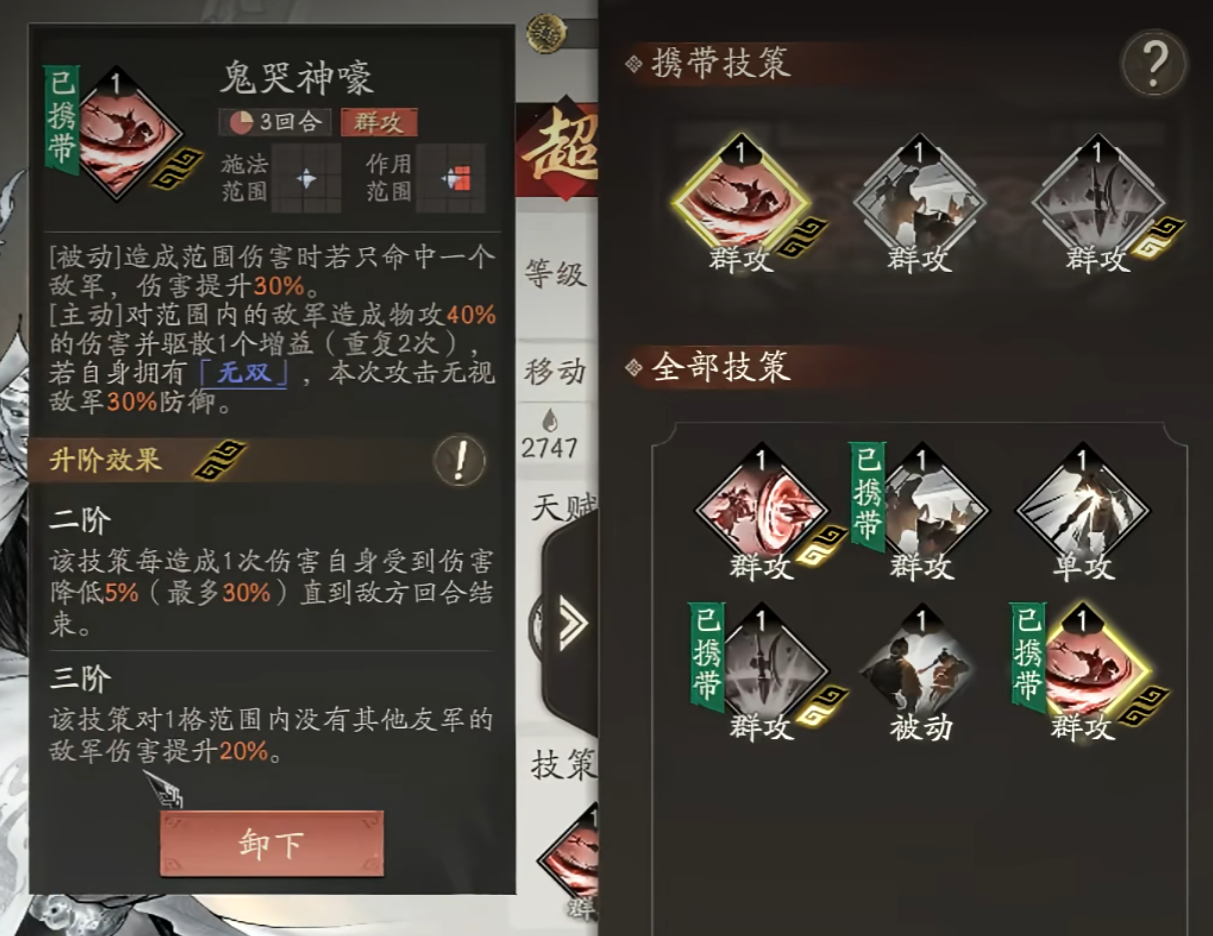 然后是《鬼哭神嚎》,看似是单体辅助技能,实则是吕布的伤害放大器。主动用能分两次打群体伤害,还能驱散敌方一个增益,无双状态下更能无视30%防御。实测下来,这技能和《辕门射戟》只能二选一戴,不过低星吕布靠它搭配天赋追伤,能快速叠满斗气,实用性拉满。