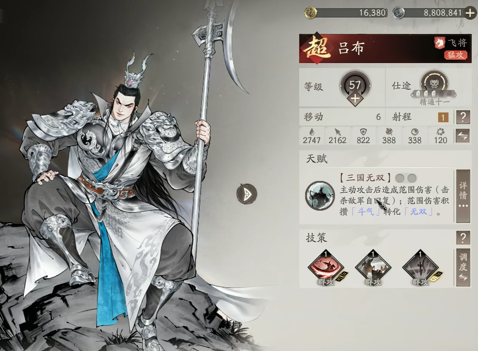 真不是吹,无双状态下的吕布才是完全体。最关键的就是所有计策、天赋的范围直接+1,这可不是简单多打一格的事儿,而是从“单点清场”到“全屏压制”的质变,不管是扎堆的小兵还是分散的精英,都能一锅端。而且无双期间主动攻击不会被反击,还能无视敌方30%防御,普攻射程也跟着提升,输出和生存直接双在线。