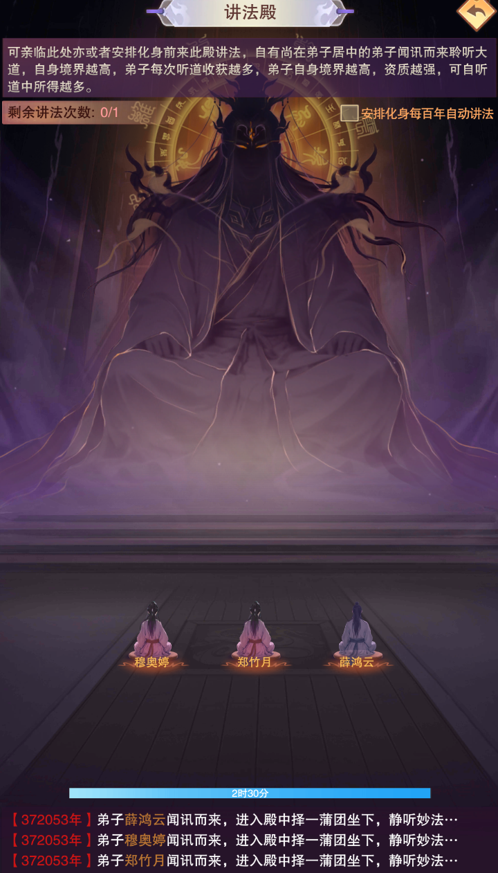 (1) 道友每百年可在讲法殿中讲法一次,未外出游历的弟子会随机进入殿中听讲;