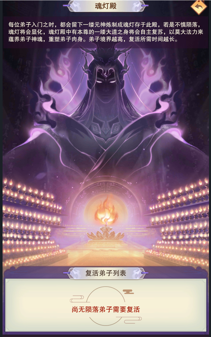 (2) 弟子外出游历时若是不幸陨落,该名弟子所属魂灯便会点亮,镇守的道身便会以莫大法力为其蕴养神魂、重聚肉身,将之复活;