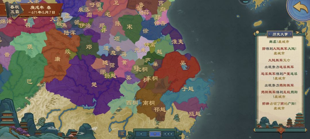随着桐国局势稳定,桐王解把目光瞄准了邗越国,因为在周边的局势中桐王解发现了一个可怕的现状,“南蛮族域”的活跃疆域范围几乎被压缩到只有淮南以南一小片区域……而中原有以周天子为首的各诸侯国拱卫,桐王解不愿再面对周天子的勤王军,于是“东夷族域”的富晓江东区域进入了桐王解的眼中