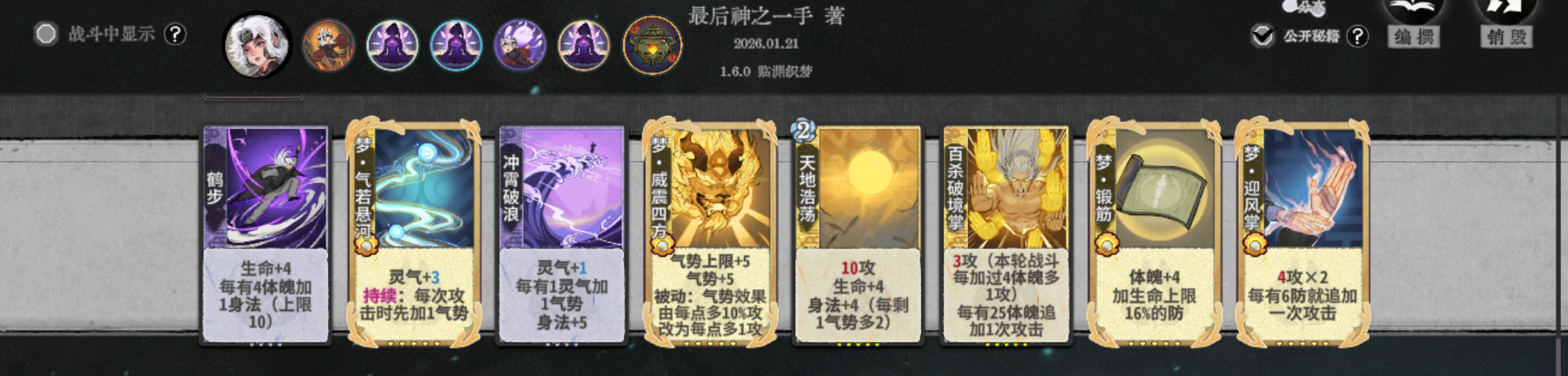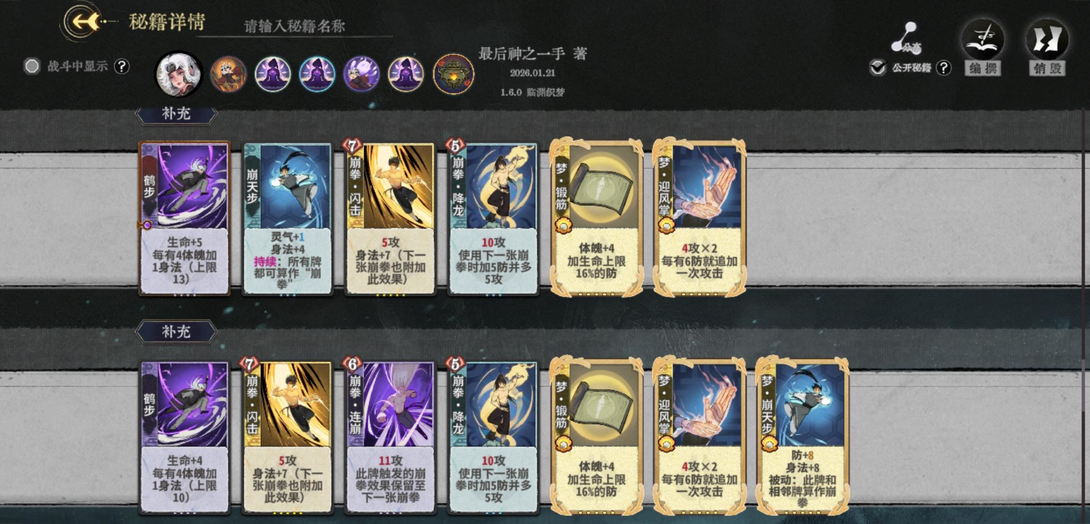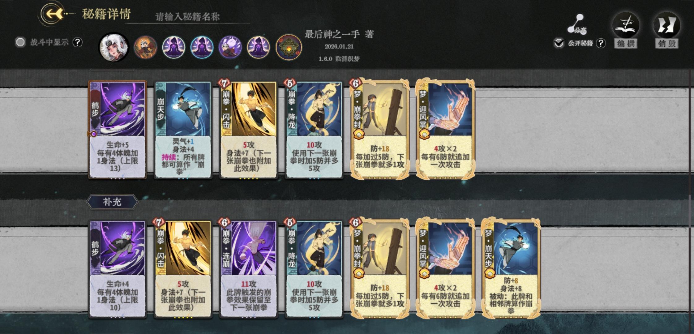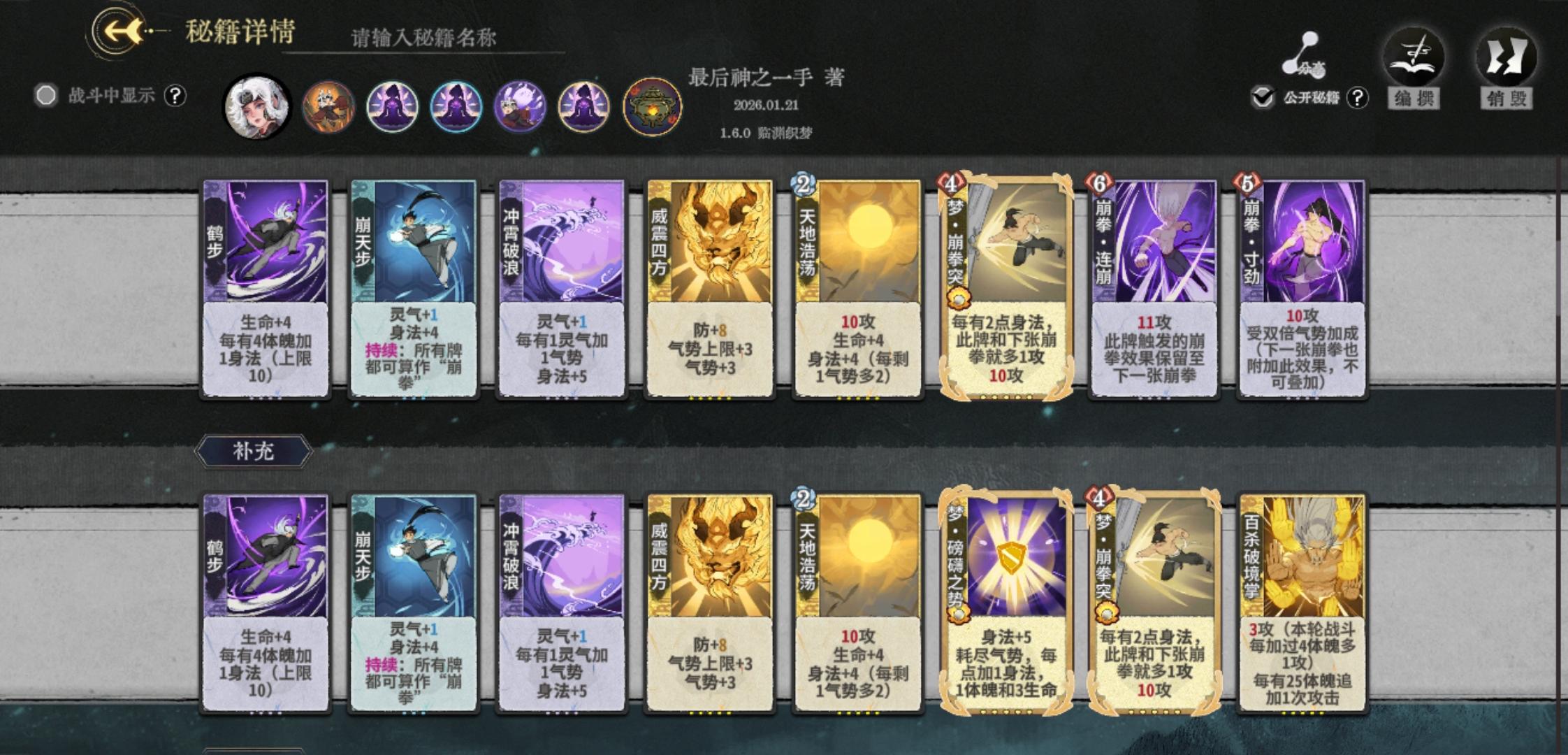 以上是攻略的全部内容,建议以理解牌组为主,上手多练几把,根据实战灵活变阵,比如被困时可以转用走地崩拳,打毒可以崩天步三动打完伤害,后面放斩魄。有什么意见欢迎大家在评论区下面讨论。