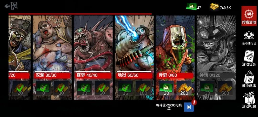 活动共分七个章节,只有通关前一个章节才能依次解锁后面章节内容,章节首次通关可以获得通关奖励。每个章节可获得的关卡奖励不同,消耗的狩猎券数量也不相同,可自由选择一个适合自己的章节进行重复挑战刷关卡奖励。