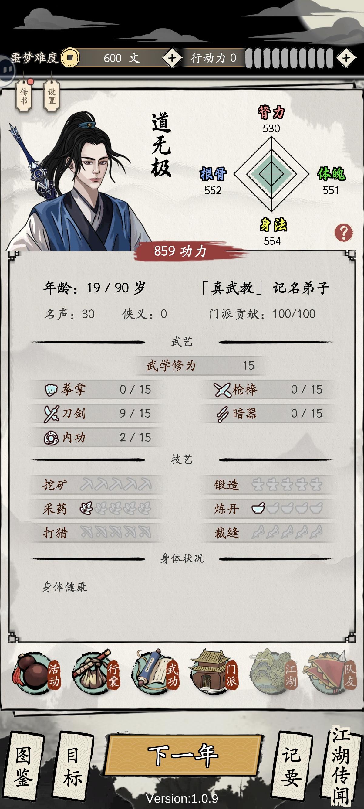 19岁,战斗教学关卡,直接跳过,并SL大法拿拳套(后面所学武功主要吃拳法和剑法熟练度)。然后看广告拿十全丹,再然后加点吃十全丹,弄完后,根骨550+其余530+左右。(题外话:决定分享过程的那个档巨黑,SL了估计得有30多次才出。)