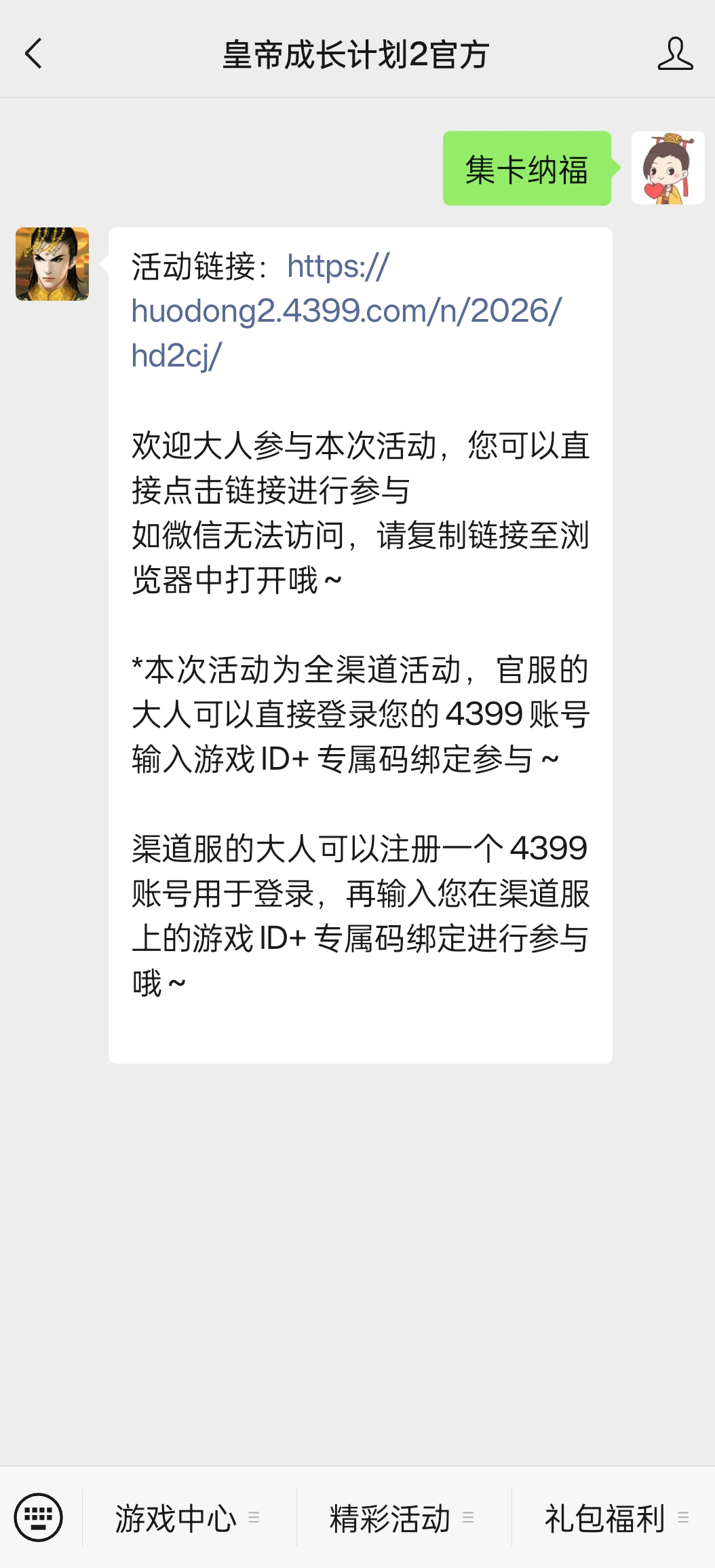 ★传送门3:前往“皇帝成长计划2官方”公众号回复“集卡纳福”获取活动链接,或点击公众号底部菜单“精彩活动-集卡纳福”直达参与