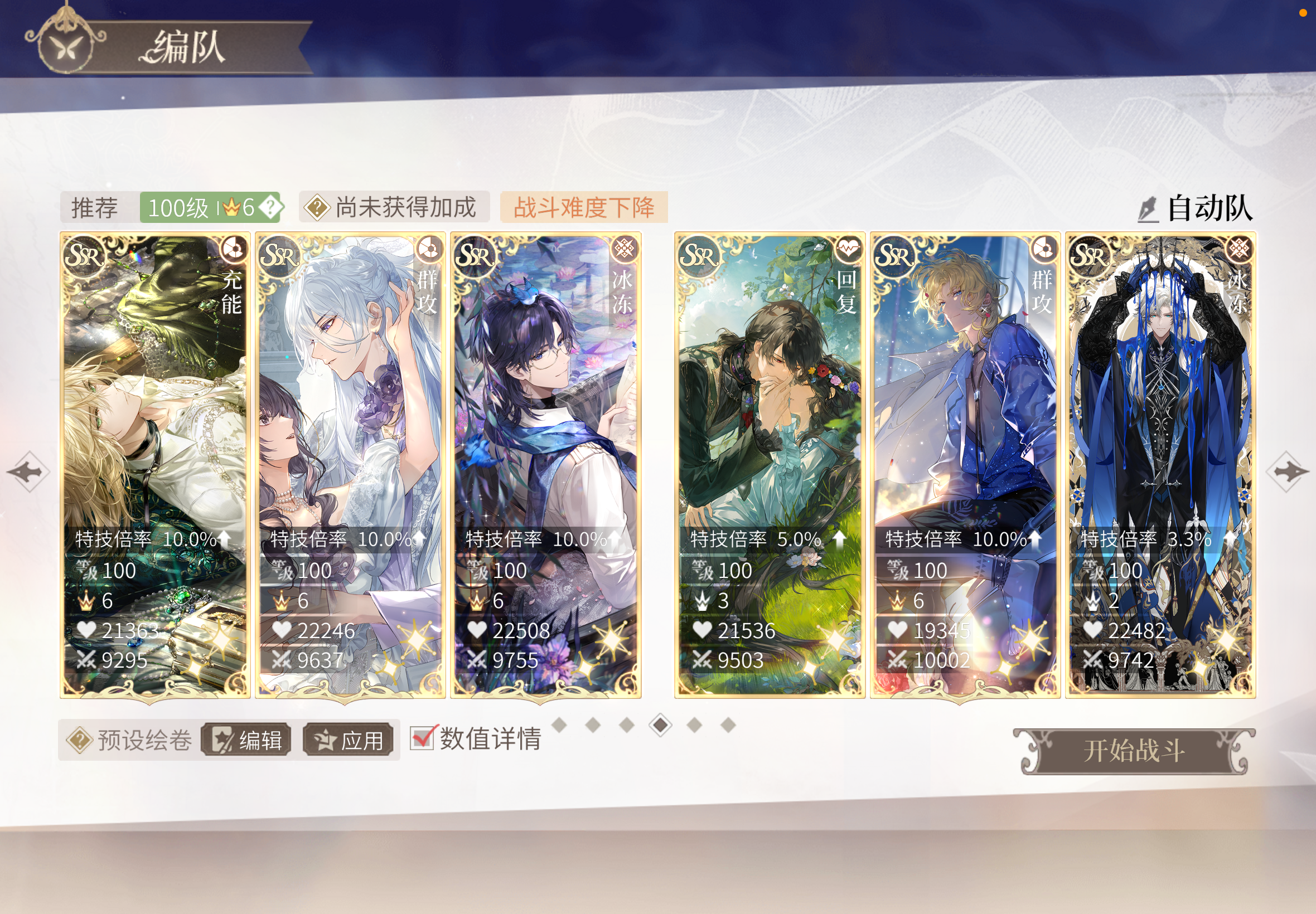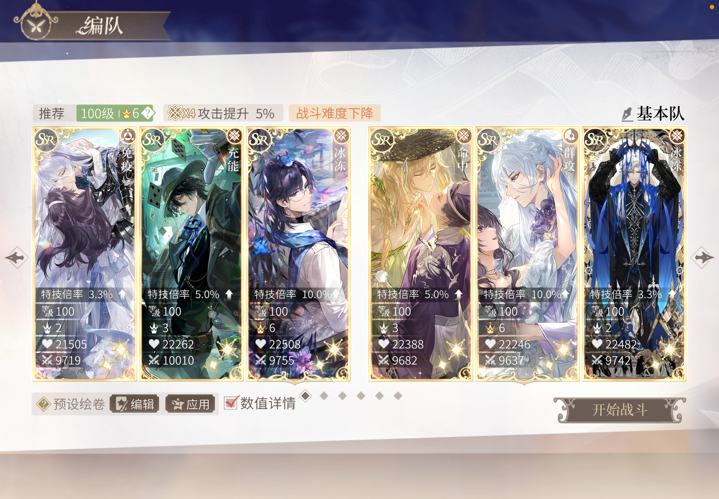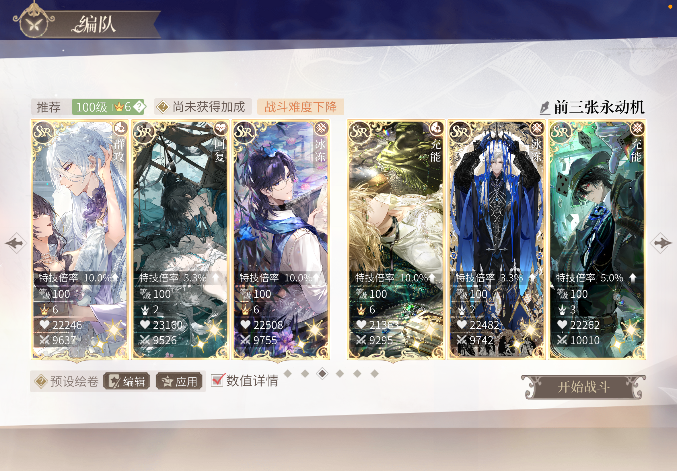 ①②号位高战百分比卡,③号位6特葳蕤(神秘小船男人,退条+推条+无敌防御,有点难平替),④号位奶卡,⑤号位高战卡,⑥号位凑边角料(我放睚眦是因为编队有攻击加成,此类卡秋季采风有梳理一二)。绘卷都是无脑拉推条的(下同)。