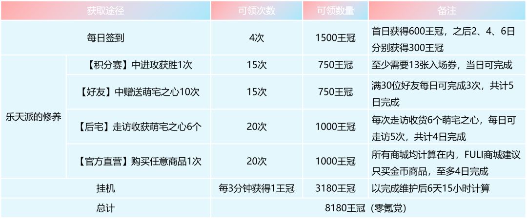 1. 本次商城贩卖的每日礼包总价6+30+30+30+30+68=194元,每日可额外获得2550王冠,活动7天内共计额外获得17850王冠。