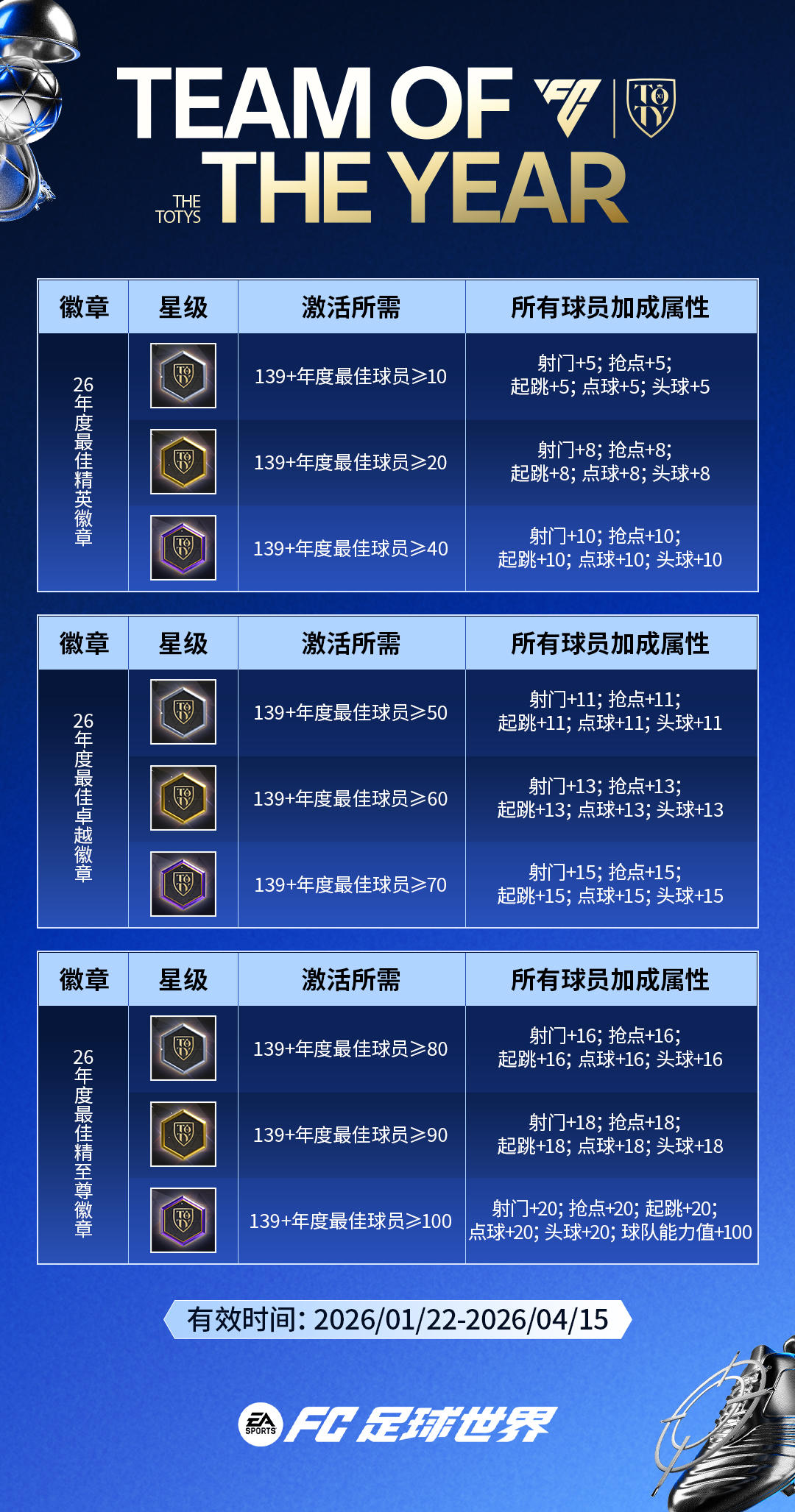 玩家需收集能力值139及以上的年度最佳球员(获得过即为点亮),达到徽章激活所需的数量即可解锁新徽章,而后可以继续收集球员解锁更高星级的加成。配备年度最佳徽章后,会提升全体球员的【射门;抢点;起跳;点球;头球】五项数据。