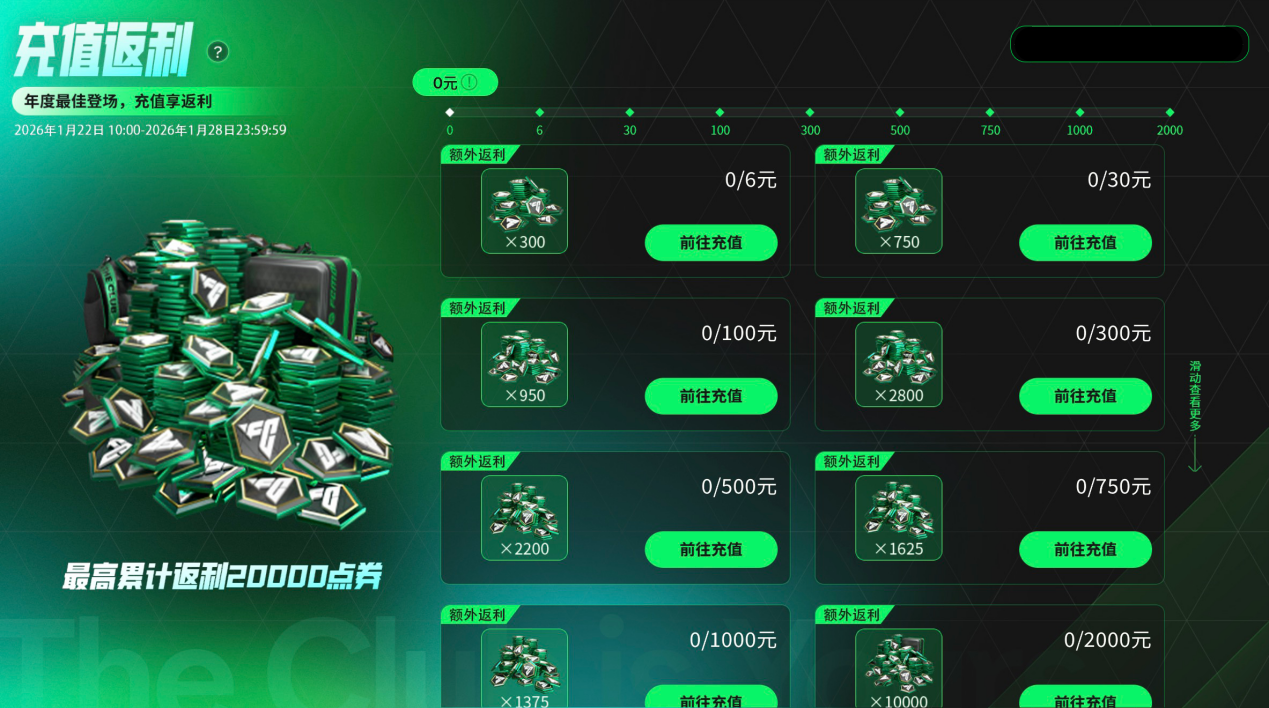 年度最佳活动登场,充值返利活动开启!活动期间,最高充值2000元,可以获得累计20000点券返利。