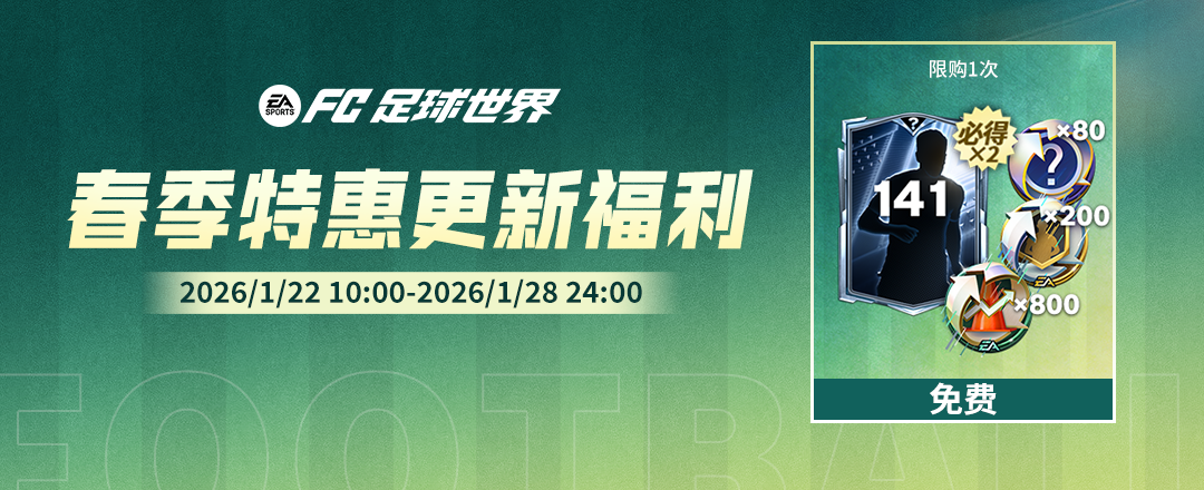 1月22日10:00-1月28日24:00,进入游戏商店可以免费领取【春季特惠更新福利】,不仅能获得2张141能力值混合球员,还能获得 800*高级进阶转移点券、200*高级强化转移点券、80*高级特训转移点券在内的丰厚好礼,精彩不容错过!