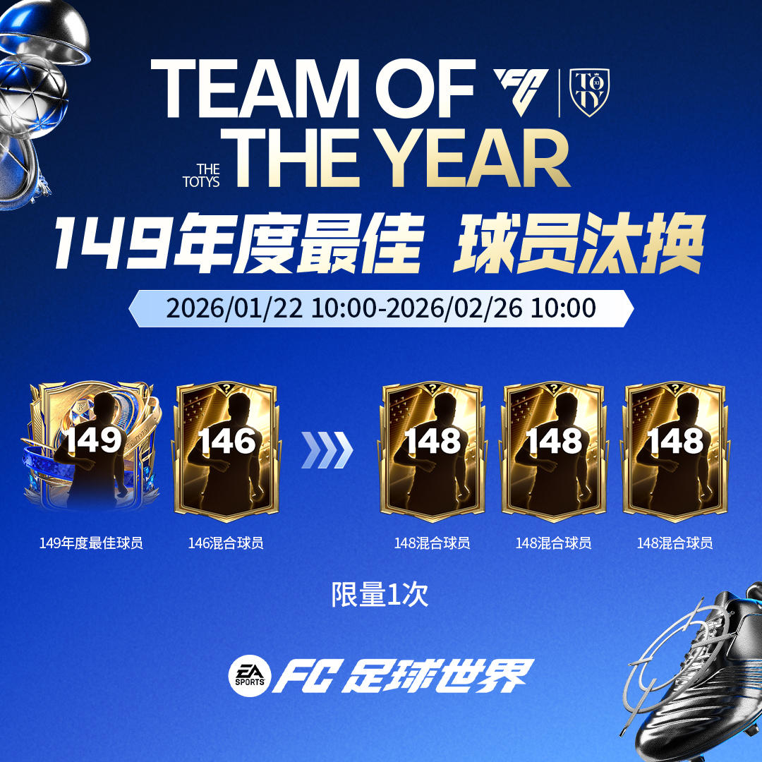 149年度最佳26球员汰换开启,活动期间,玩家可以使用1张149能力值年度最佳26球员、1张146能力值混合球员,交换获得3张148能力值混合球员。该交换仅限参与一次。