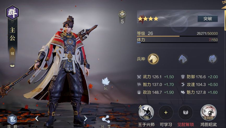 开局送的主公,也是个很好的辅助,技能王于兴师,能增加我方武将伤害,