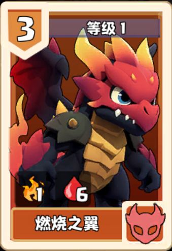 燃烧之翼,种族归属--‘龙’,待机值3,1级基础属性1|6,满级基础属性2|9。燃烧之翼属于法坦,因为有着较高的生命值,可以配合他的技能打出稳定的伤害。