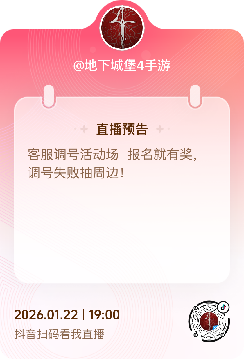 今晚以及明晚19:00在“地下城堡4手游”抖音官方直播间,都会举行外援调号的专场活动,欢迎感兴趣的堡主们前往参与或围观~