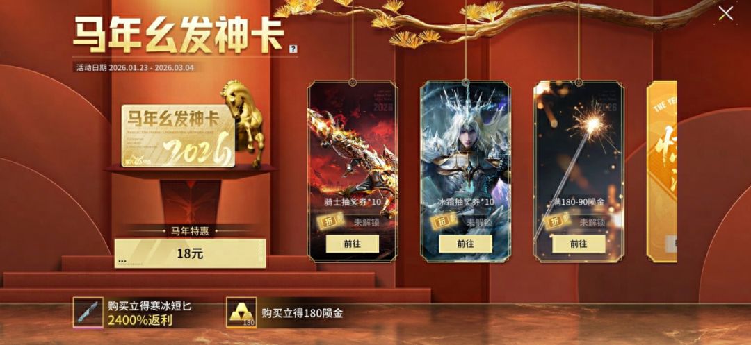 但这还不够,真正的重头戏还得看「马年幺发神卡」和首把炫彩枪械皮肤盔甲马「圣铸御骑」登场,送免费刀皮和抽奖券*20,主打一个 “horse成双”!