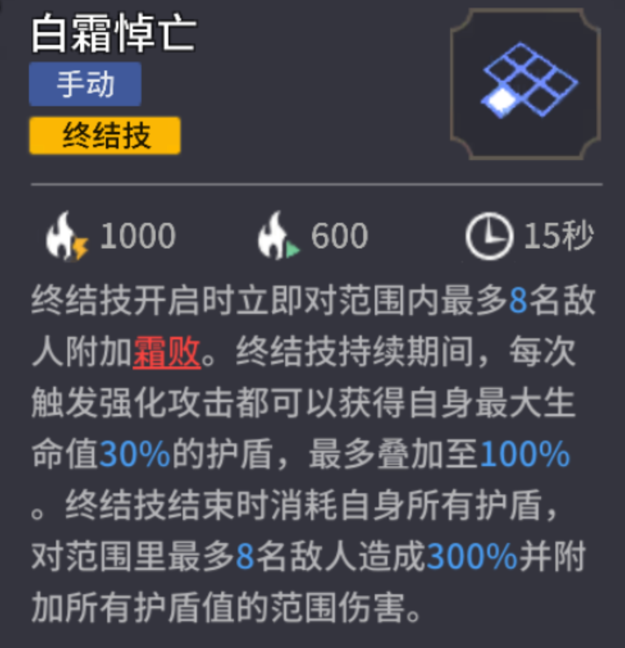 终结技(群体输出):终结技是3段式伤害构成,分别是霜败、持续普攻触发特殊攻击、结束时一段爆发。2次普攻可触发一段特殊攻击,特殊攻击、最后一段爆发均与护盾量有关,护盾越高、伤害就越高。