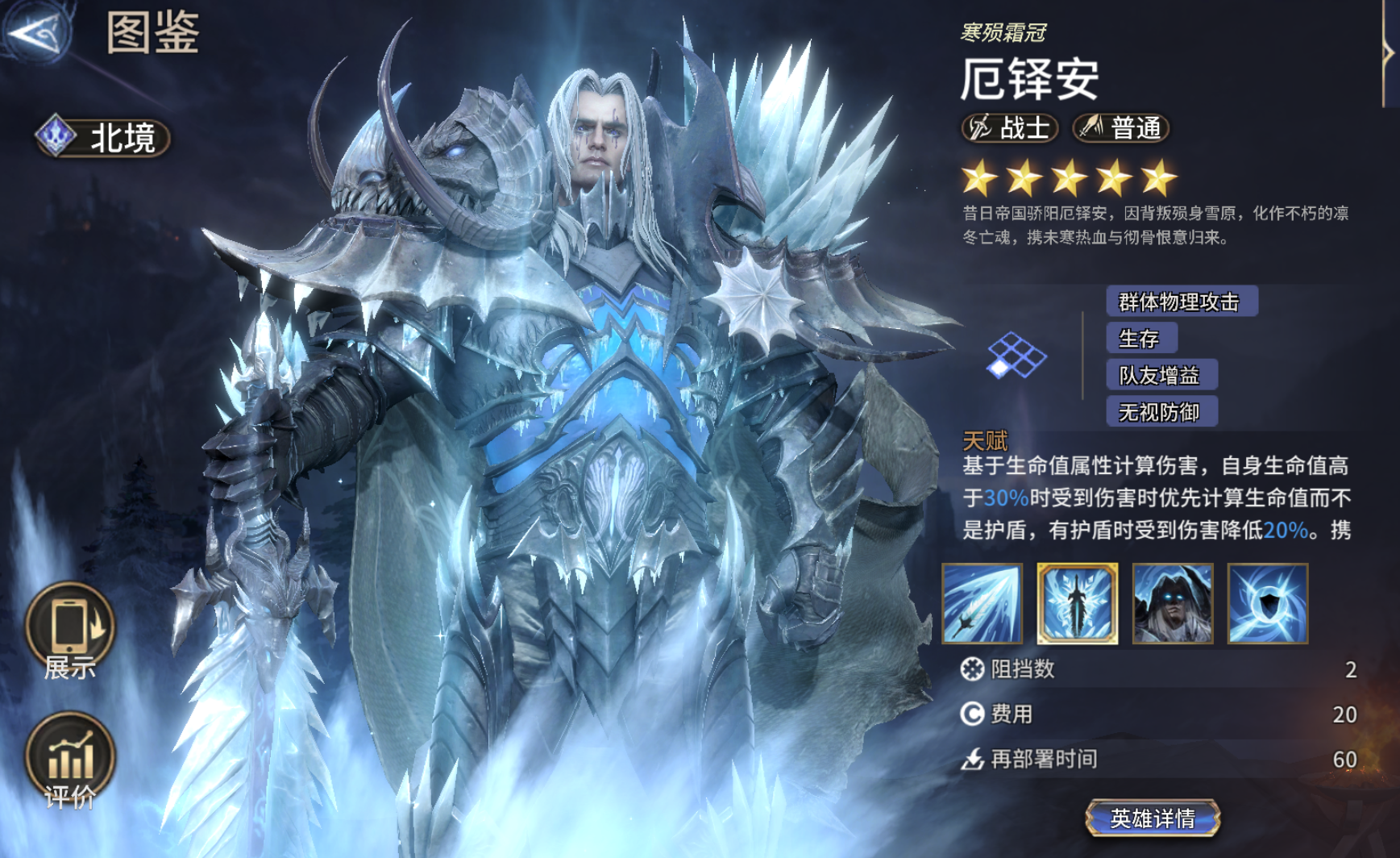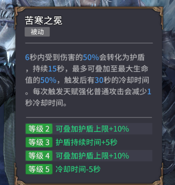 苦寒之冕(护盾):触发时可将受到伤害50%转化为护盾,相当于是降低50%伤害。再加上天赋“有护盾时降低20%伤害”,厄铎安可以拥有相当出色的承伤能力。