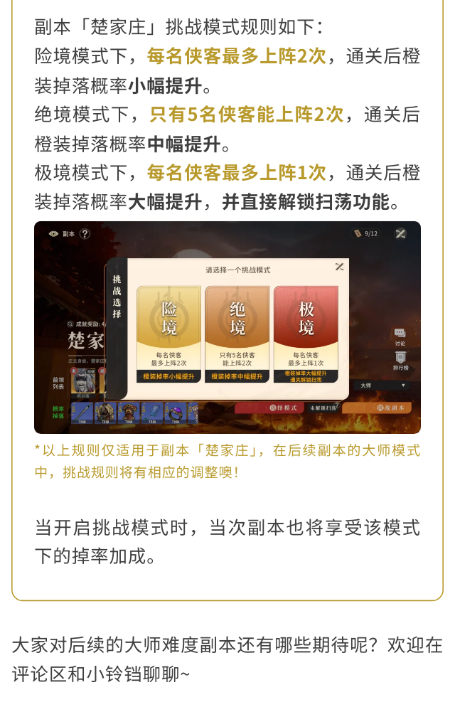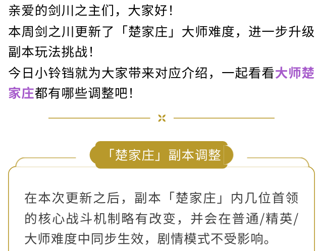 副本更新 |「楚家庄」大师难度上线,副本机制调整!