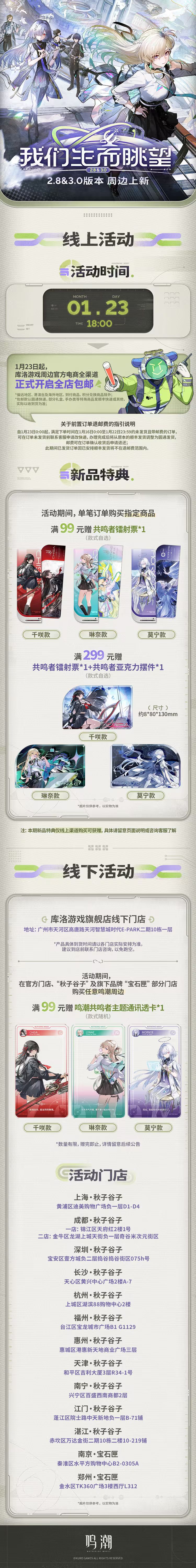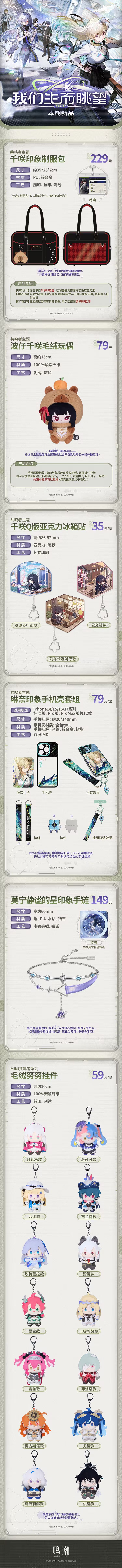 本次上新的周边品类丰富多样,涵盖千咲、琳奈、莫宁三大角色的专属主题礼盒,同时推出入校凭证系列工卡挂件、星炬衔梦系列周边、千咲印象制服包、波仔 & 千咲毛绒玩偶等多款单品,琳奈印象手机壳套组、莫宁印象手链、共鸣者系列努努(第二弹)也同步加入上新清单,覆盖配饰、包袋、玩偶等多种类型,满足玩家不同的收藏与使用需求。