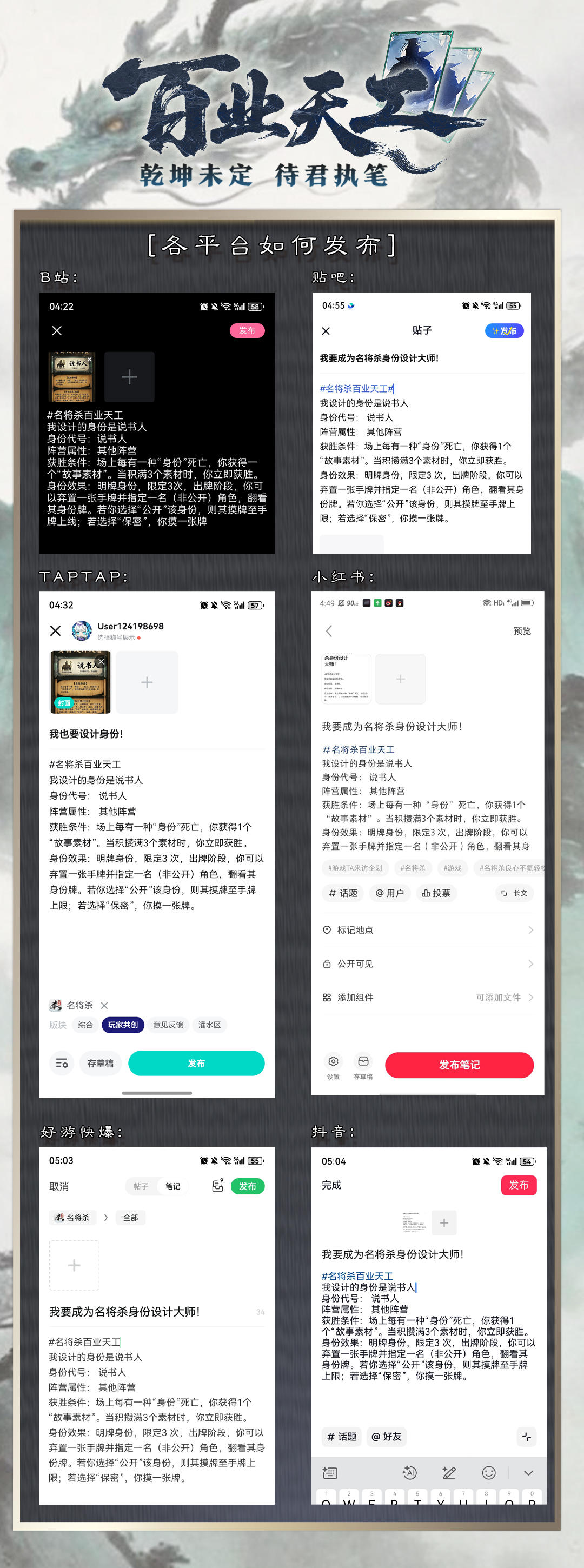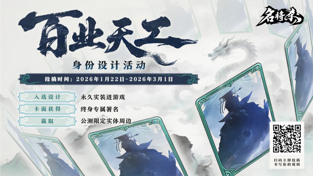 在 taptap、抖音、贴吧、b 站、快手、小红书、好游快爆等平台任选其一,带话题 #名将杀百业天工 ,发布你的设计方案。