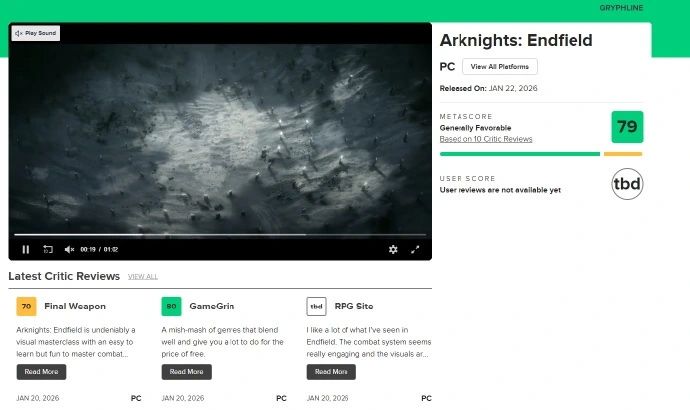 科技有限公司自主研发的3D即时策略RPG游戏《明日方舟终末地》,它的媒体评分已经解禁啦!在著名的评分网站Metacritic上,基于多家媒体的评价,游戏拿到了79分的均分,这个开局分数在同类手游里可以说是相当不错了,对终末地来说算是个“开门红”。
