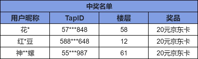 获奖名单已公示,恭喜以下玩家获奖: