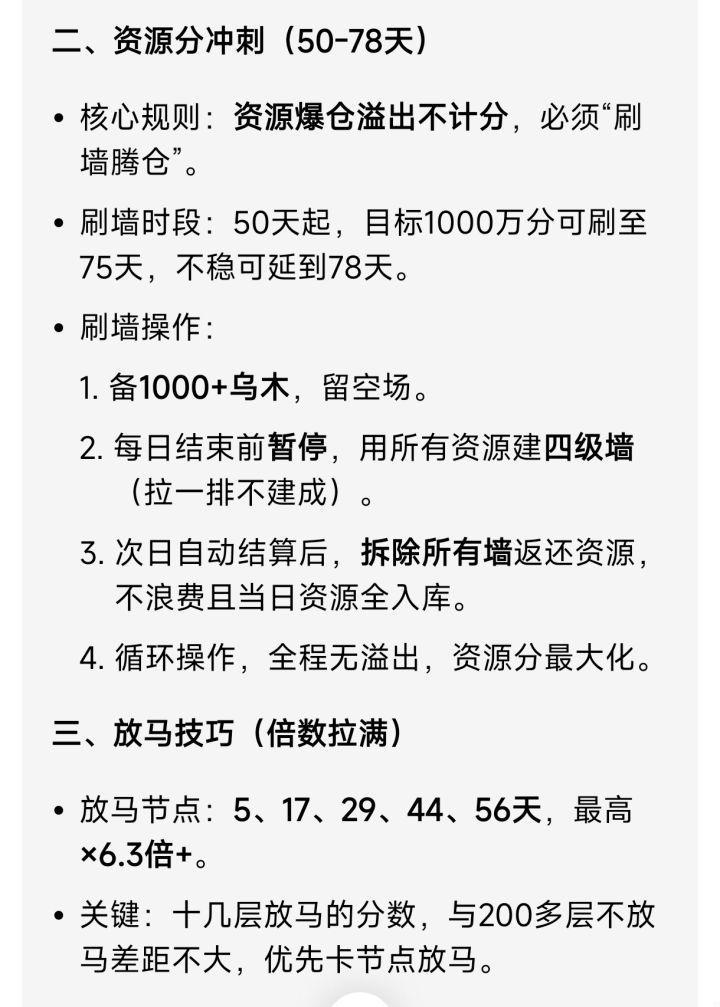 4.关于刷分问题,资源爆仓溢出的部分是不算分的,所以我们要刷墙。尽可能50多天就开始刷,刷到75天结束,感觉没把握刷满1000万资源分的话,可以刷到78天。。