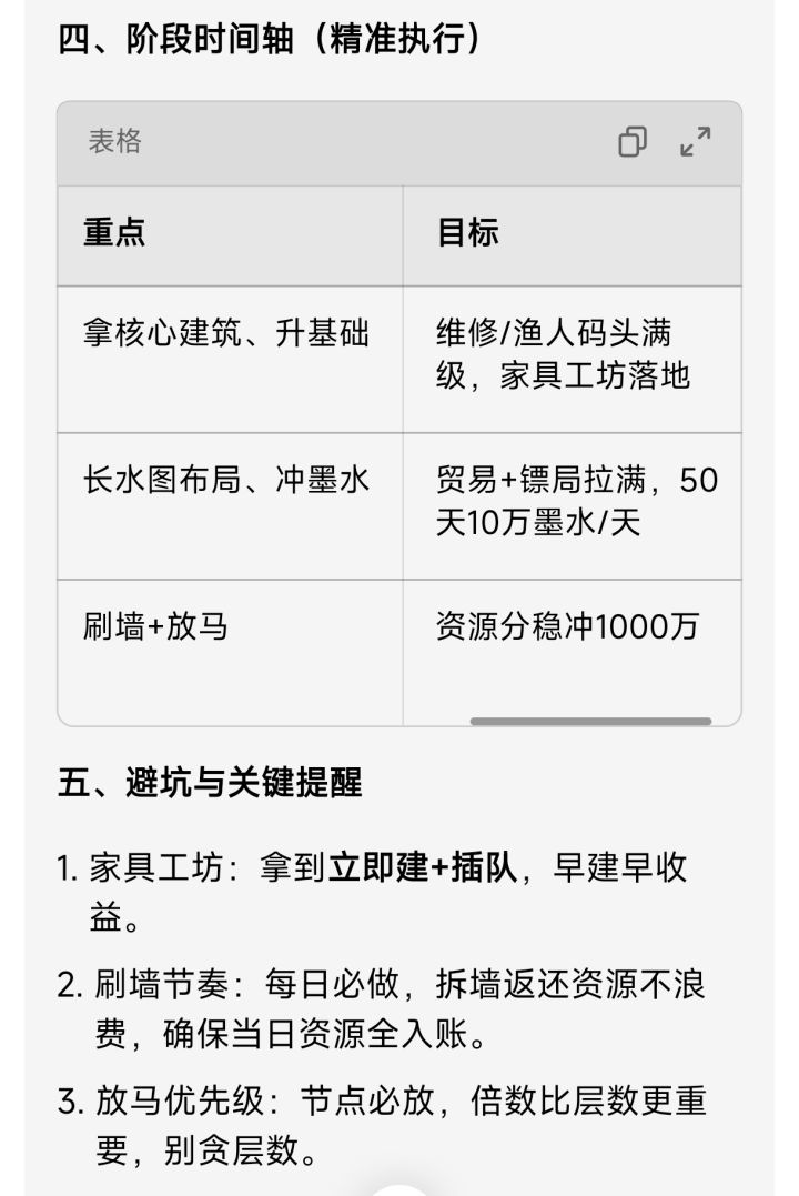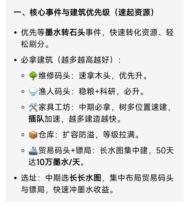 3.中期一定要找长长水图的位置,做大量的贸易码头跟镖局,最好50多天能达到10万墨水一天。