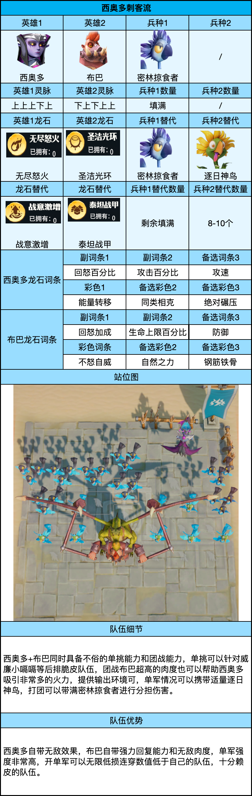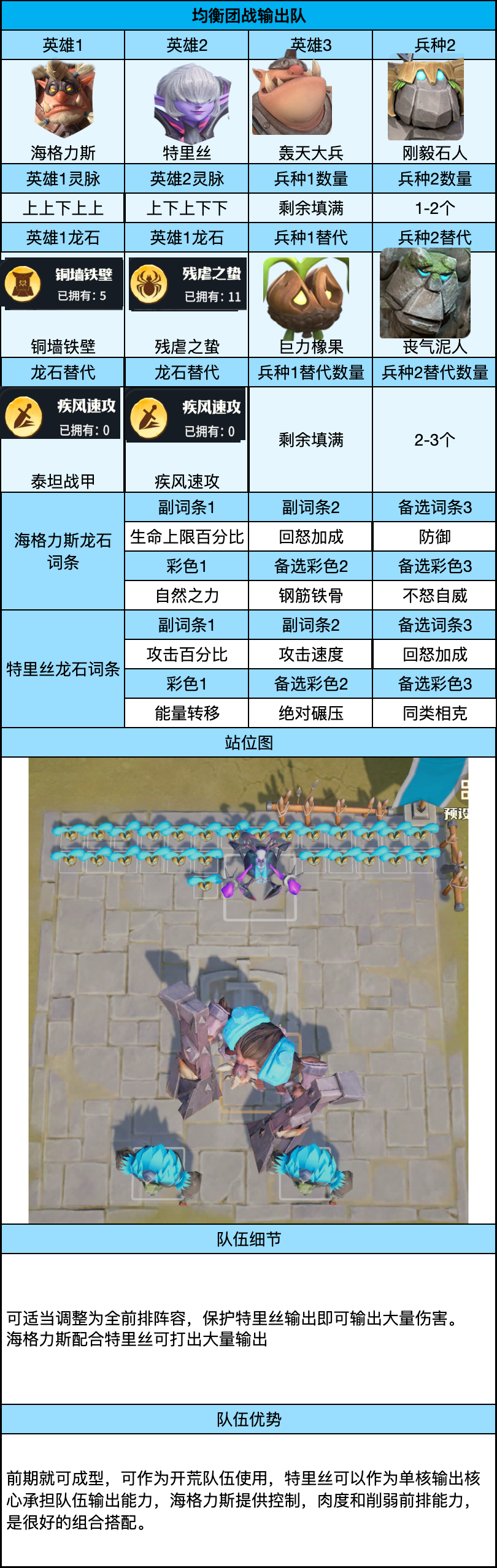 其余队伍则走团战辅助流,搭配托尔、蕾安、罗宾、海格力斯等强力辅助,并辅以特里丝、威廉等团战输出。优先保证单军强度,战斗时以单挑队开路,同时兼顾团战队伍;