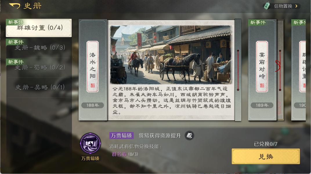 首次兑换史册技能时,会对特定武将信物有要求,但后续升星时,只需要指定阵营的橙将信物,不再需要反复消耗同一名武将。